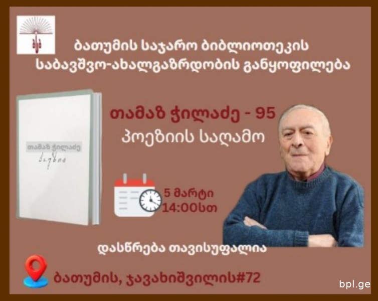 5 მარტს, 14:00 საათზე, ბათუმის საჯარო ბიბლიოთეკის საბავშვო-ახალგაზრდობის განყოფილებაში გაიმართება XX საუკუნის ქართული ლიტერატურის ერთ-ერთი გამორჩეული წარმომადგენელის ქართველი პოეტის, მწერლისა და დრამატურგის თამაზ ჭილაძის დაბადებიდან 95 წლის იუბილესადმი მიძღვნილი პოეზიის საღამო.